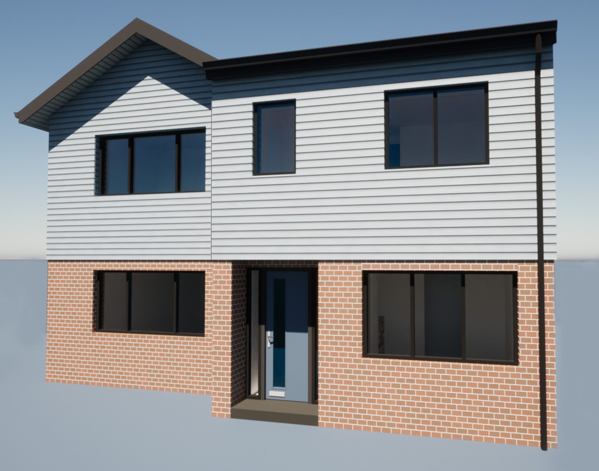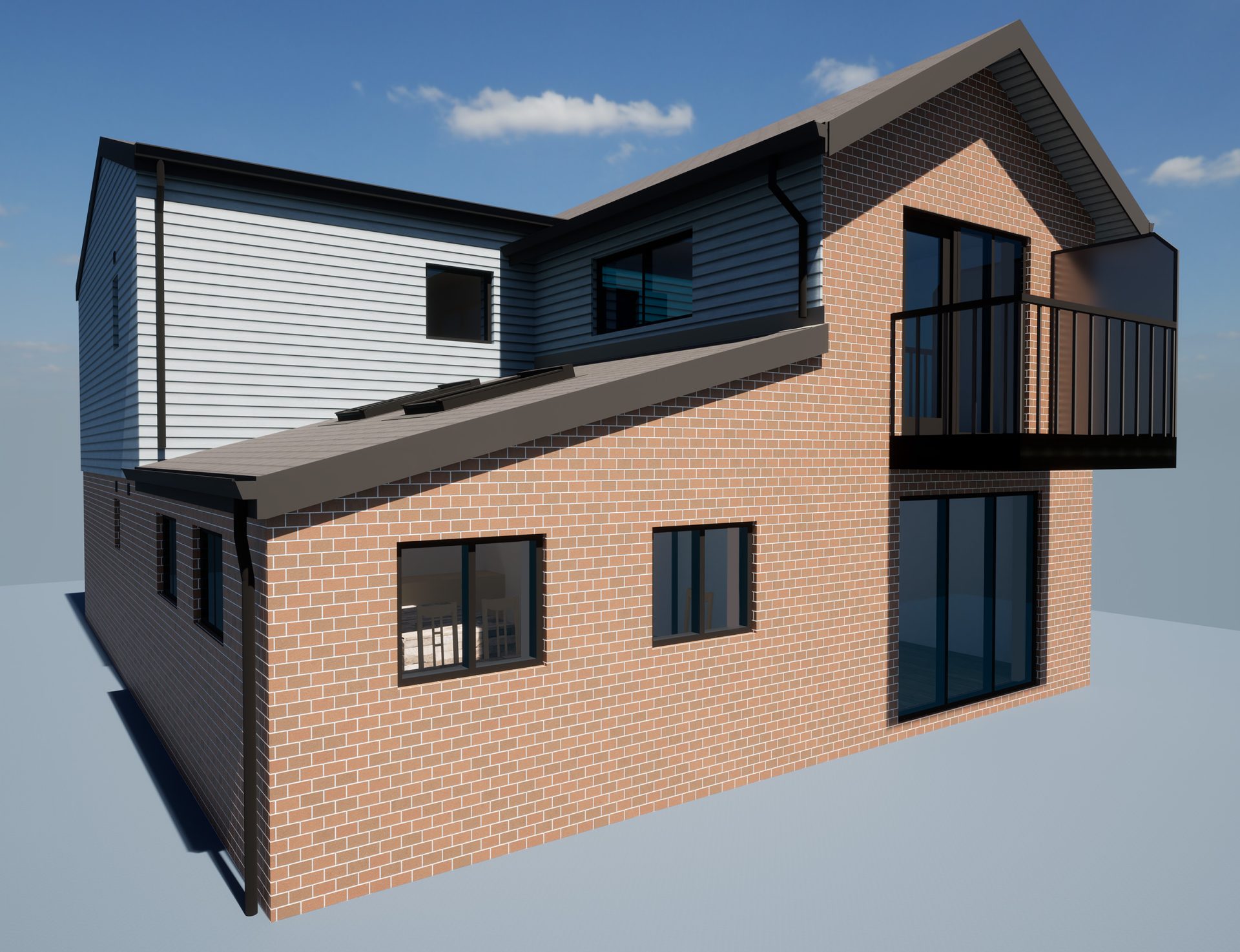 The finished design concept included a part single-storey extension to the rear, to create the large kitchen/diner area, and part two-storey extension at the front with a sloping roof with dormer window. To create the unique look they sought, we specified the exterior be part-wrapped in a blue/grey timber effect cladding.