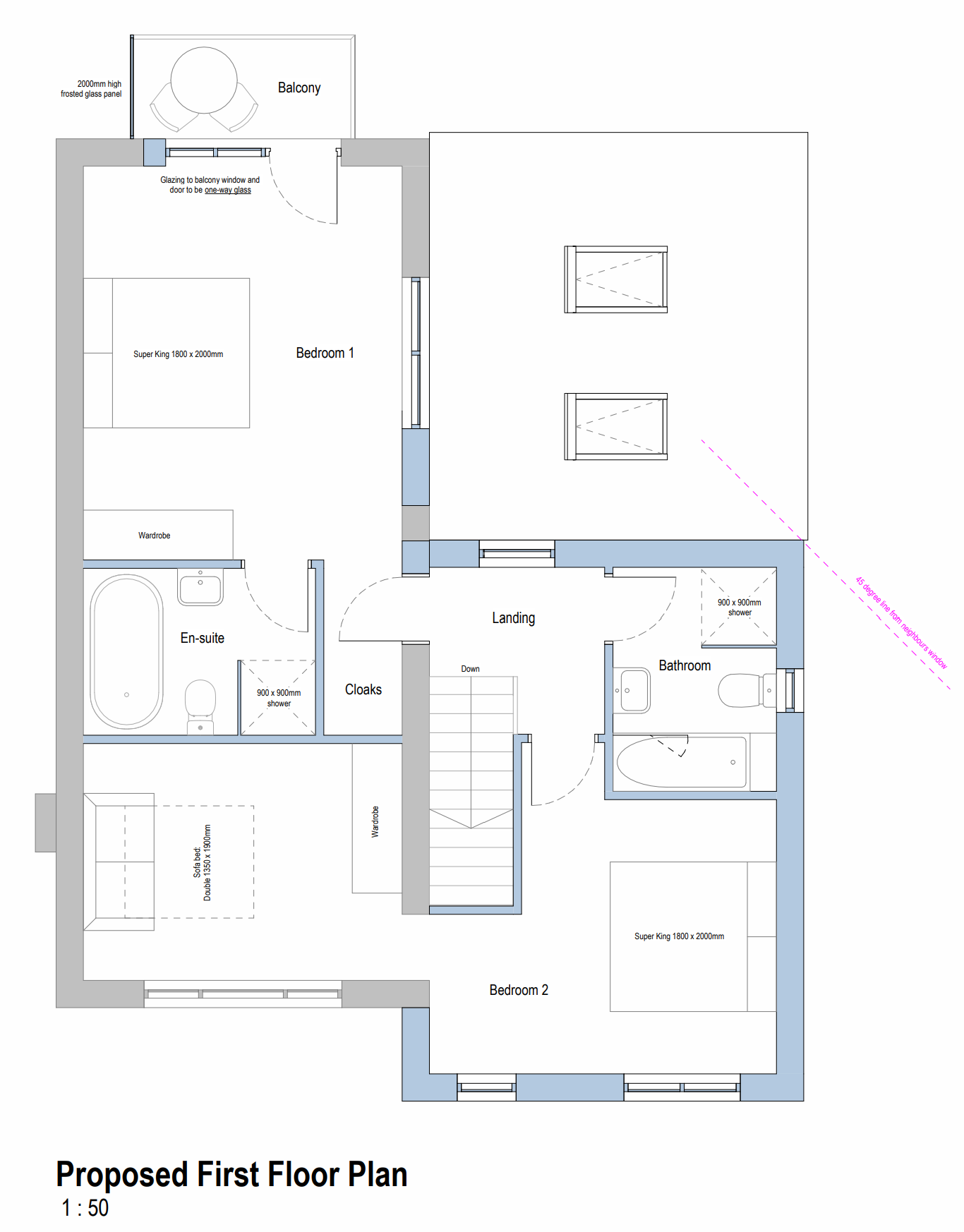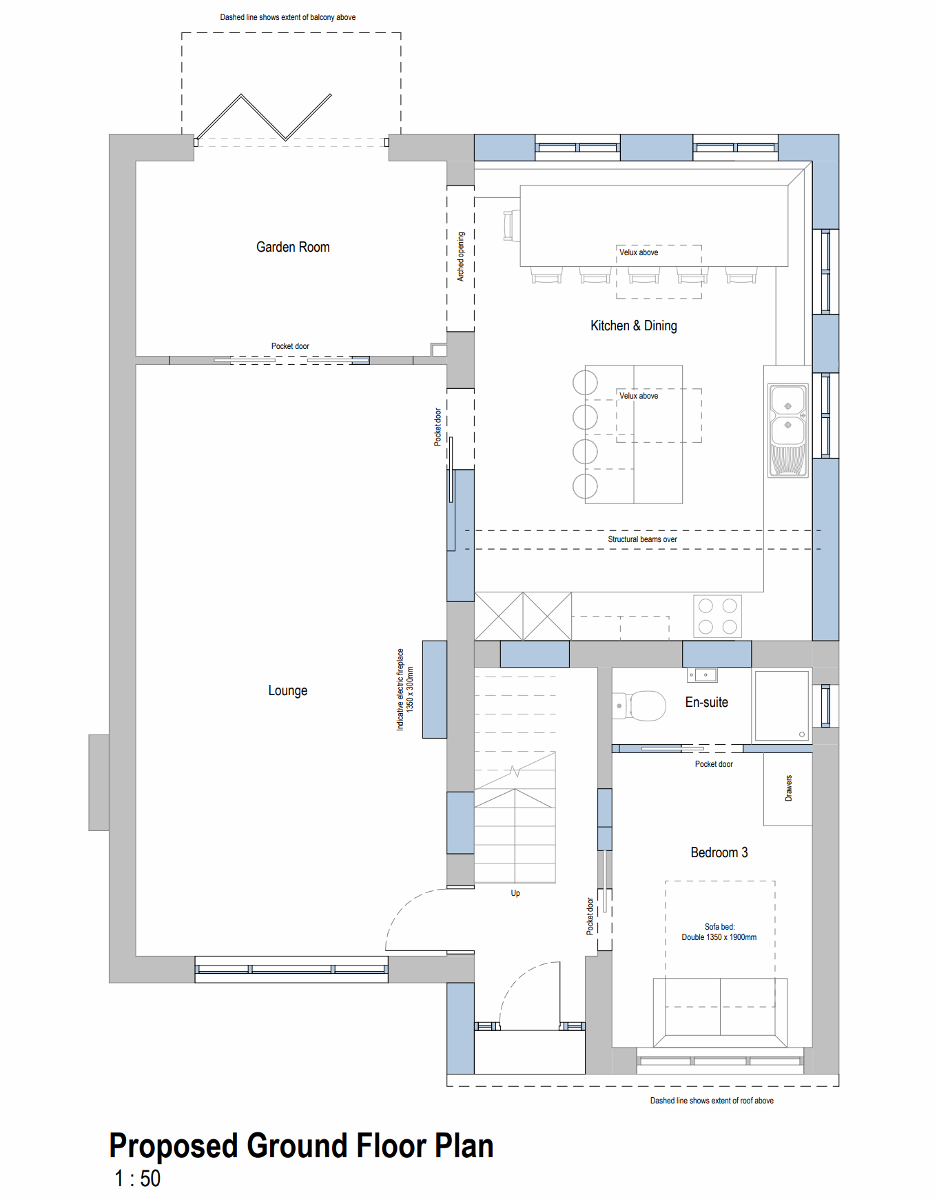 While some initial proposals had to be compromised to achieve planning permission (a feature fireplace, Velux window to create a light hall, and ‘hidden’ door to the ground floor en suite), we were delighted to navigate our way through the process to secure the balcony and distinctive external features. Full planning permission has been granted based on the design concepts shown, however the construction work is yet to start.